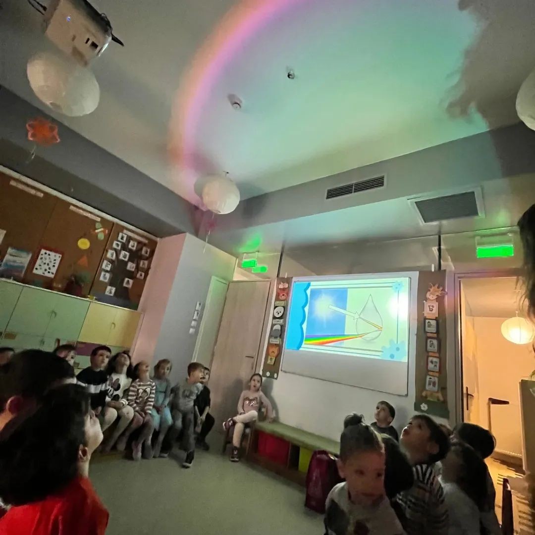 Πώς δημιουργείται το ουράνιο τόξο; Πότε δημιουργείται; Μπορούμε να φτιάξιμο εμείς ουράνιο τόξο; Αφού οι μαθητές του Προνηπίου και του Νηπιαγωγείου προσπάθησαν να δώσουν απαντήσεις στα παραπάνω ερωτήματα διερεύνησαν το φαινόμενο του ουράνιου τόξου με τη βοήθεια της φυσικού κ.Ελλης Κωβαίου την Πέμπτη 9 Οκτωβρίου.