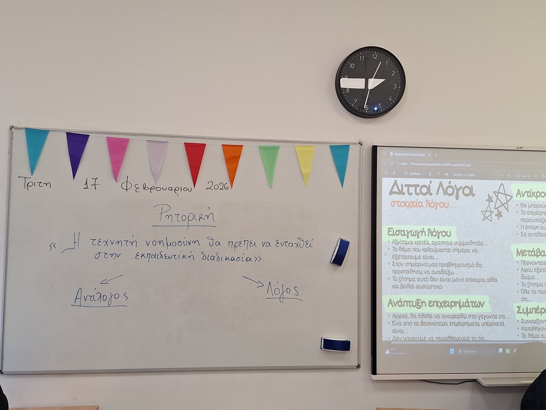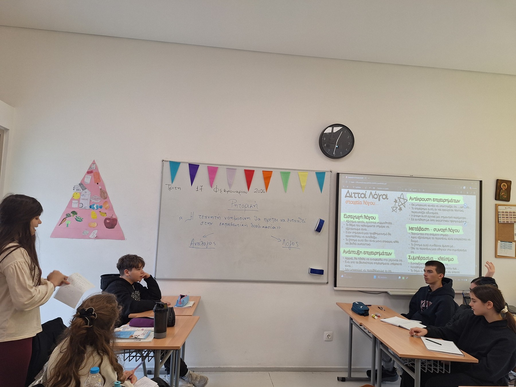 Οι μαθητές συμμετέχουν ενεργά σε διαδικασίες debate, καλλιεργώντας την επιχειρηματολογία και τον κριτικό τους λόγο. Με ζωντάνια και ενθουσιασμό ανταλλάσσουν απόψεις πάνω σε επίκαιρα ζητήματα, μαθαίνοντας να ακούν, να σέβονται τη διαφορετική οπτική και να υποστηρίζουν τεκμηριωμένα τις θέσεις τους. Ο Όμιλος Ρητορικής αποτελεί έναν δημιουργικό χώρο έκφρασης και διαλόγου, όπου η σκέψη, ο λόγος και η συνεργασία συνδυάζονται, ενισχύοντας την αυτοπεποίθηση και τις επικοινωνιακές δεξιότητες των μαθητών.